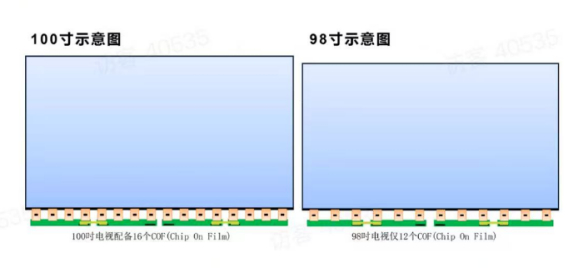 比如画质上,100吋比98吋有着更好的画质表现。原因在于COF这一芯片贴膜技术,100吋可以携带16个,而98吋通常带12个。因为COF数量多,电视的对比度就更高,颜色表现更好。这使得电视的画面亮度、对比度和颜色饱和度都有显著提升,从而提供更优质的视觉体验。