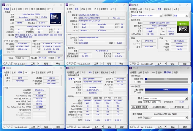 在CPU-Z测试中,全默认情况下,酷睿Ultra 7 265K的单核得分870.3,多核得分15616.1,而在启用IPO以后,处理器的单核性能提升至887.2,提升约2%,多核则提升了6%,来到了16564.2。