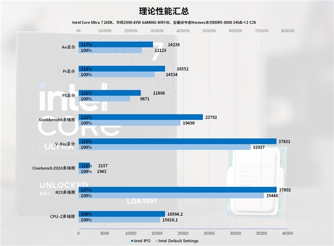 在Blender与V-Ray的渲染测试里也基本反应了类似的情况,酷睿Ultra 7 265K在开启IPO以后,最大可以实现17%的性能提升。