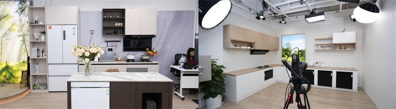 大家电产品有两个特点,第一就是型号特别多,第二就是体积大,不方便挪动,不像小商品那样在一个场景里就可以把所有的产品都展示到。在直播间里,基本上一个房间的话至少都包含3个景以上,最多的一个房间有 13 个场景。
