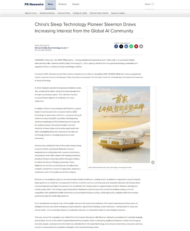 其技术布局也获得了国际媒体的关注。时代周刊、路透社、美联社均有相关报道,提及“中国企业睡眠科技值得美国关注”。另有消息称,多家国际头部AI公司已与喜临门接触,探讨战略合作可能。