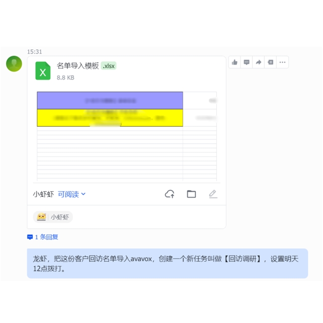 “龙虾,把这份客户回访名单导入avavox,创建一个新任务叫做【用户调研】”